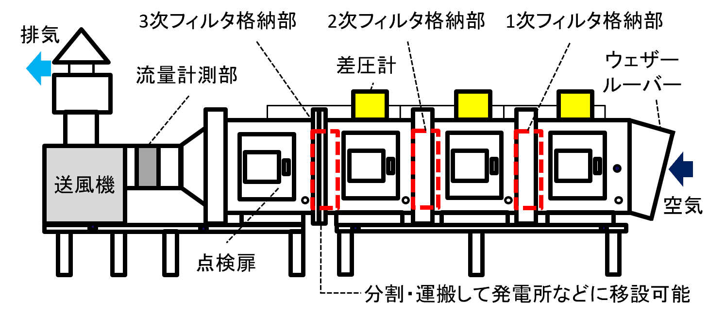 燃焼用に大量の空気を必要とするガスタービンの吸気口には、設備保護のために、吸気フィルタが用いられています。このフィルタは、大気中の粉塵を捕集することで目詰まりが生じて差圧が上昇するため、適切な時期での交換が必要です。本設備は実際の発電所と同じフィルタ構成ができるように、1次フィルタから3次フィルタを直列に設置することができ、発電所におけるフィルタ1枚当たりの流量で大気を連続吸気することができます。