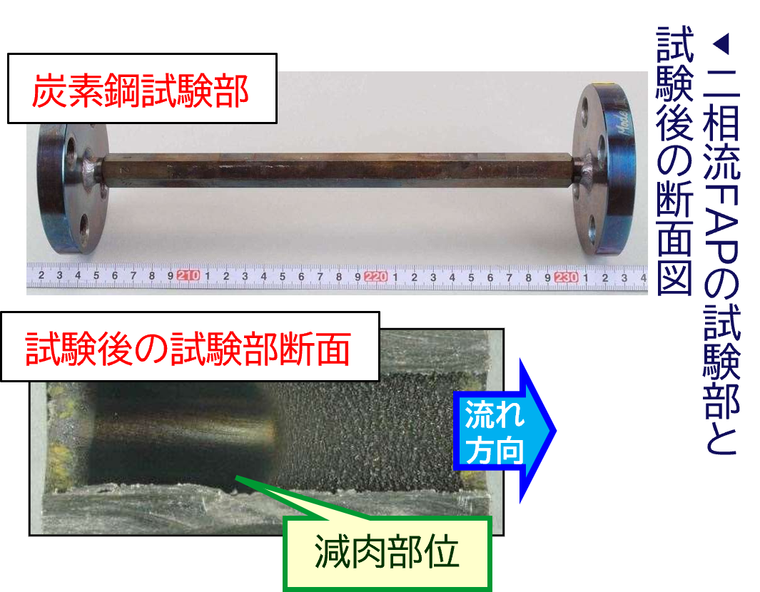 火力/原子力発電所の配管に生じる減肉(配管内壁からの溶け出しや損傷)量を予測し、適切な交換時期の目安にするため、配管減肉現象を再現できる設備で、流速、水質、材料などの条件を変えて減肉量を測り、予測評価手法の確立を目指しています。