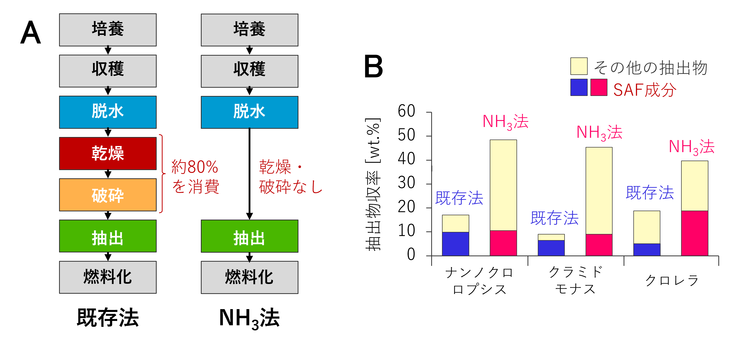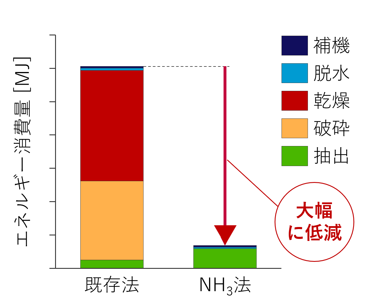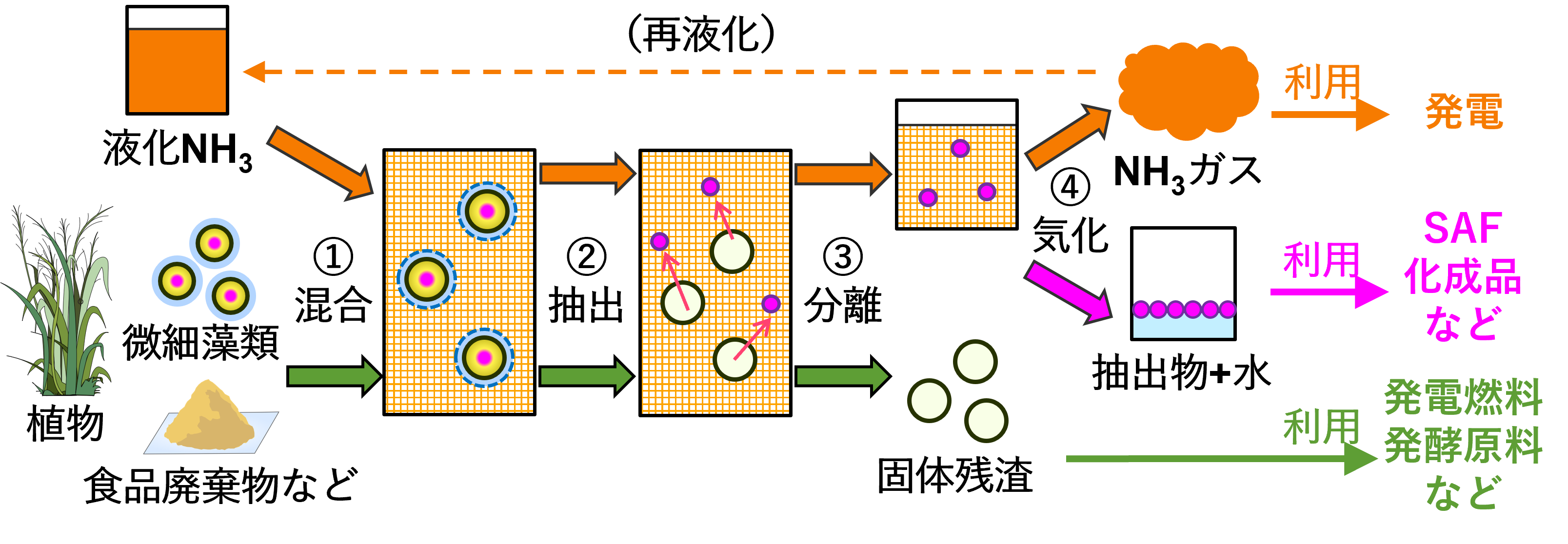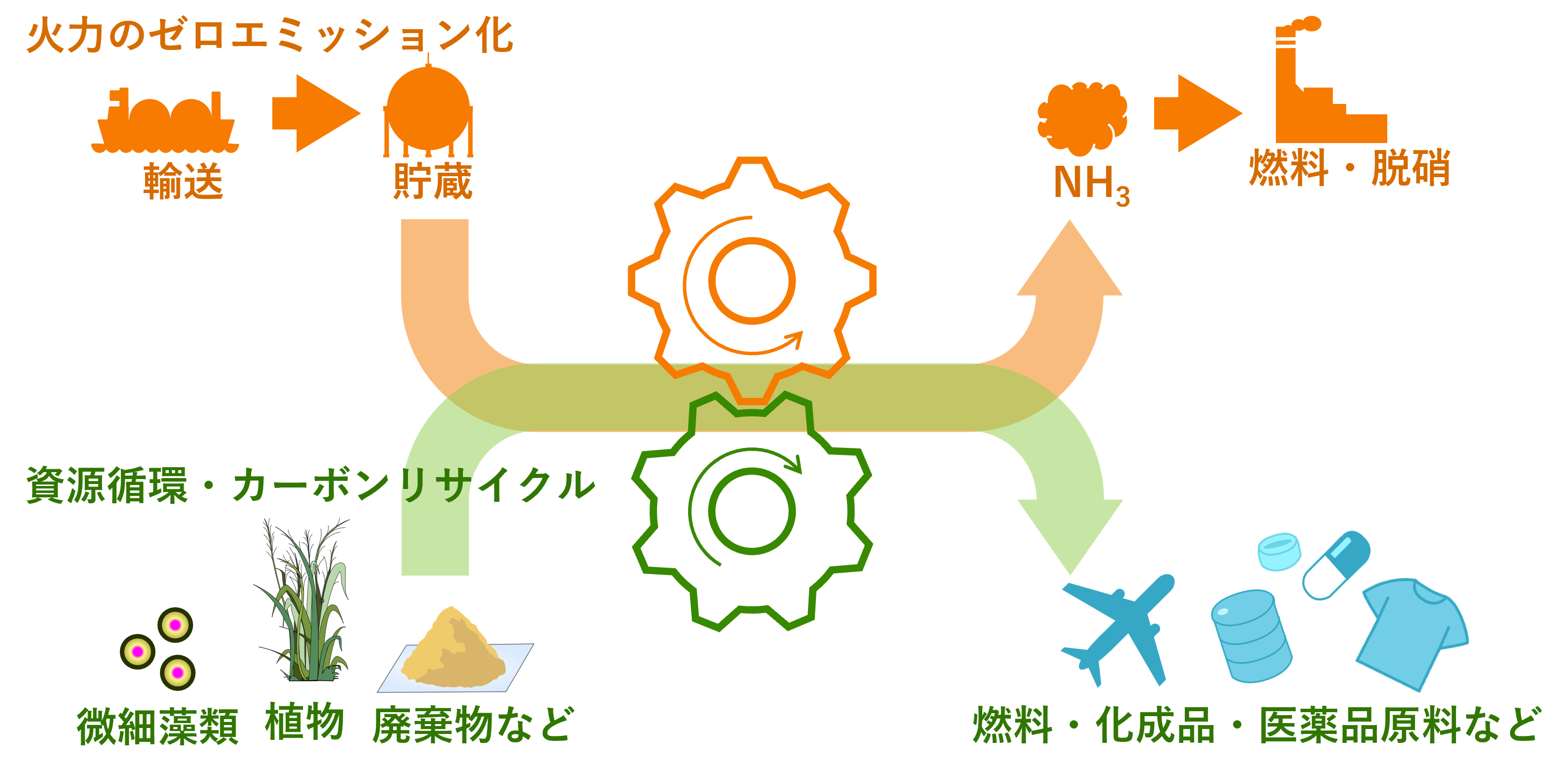 国内の二酸化炭素(CO₂)排出量の約4割を占める火力発電所では、アンモニア(NH₃)を脱炭素燃料として利用することで、CO₂排出量を削減する取り組みが進められています。電力中央研究所では、発電所に受け入れる際の液体状態のアンモニアが、バイオマスから有用成分を抽出するための溶媒として活用できることを見出しました。そこで、燃料として燃やす前の液化アンモニアを抽出溶媒として活用することにより、発電時のCO₂排出量を削減しながら、バイオマス由来カーボンリサイクル製品(バイオ燃料、化成品、医薬品など)を併産する新たな事業の創出を支援する技術開発に取り組んでいます。