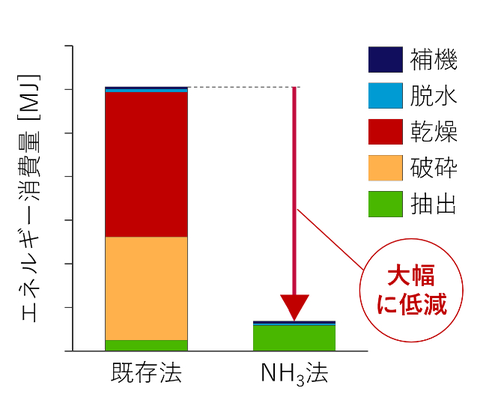 国内の二酸化炭素(CO₂)排出量の約4割を占める火力発電所では、アンモニア(NH₃)を脱炭素燃料として利用することで、CO₂排出量を削減する取り組みが進められています。電力中央研究所では、発電所に受け入れる際の液体状態のアンモニアが、バイオマスから有用成分を抽出するための溶媒として活用できることを見出しました。そこで、燃料として燃やす前の液化アンモニアを抽出溶媒として活用することにより、発電時のCO₂排出量を削減しながら、バイオマス由来カーボンリサイクル製品(バイオ燃料、化成品、医薬品など)を併産する新たな事業の創出を支援する技術開発に取り組んでいます。